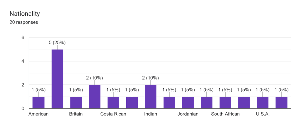As expected, nationality data was diverse and teachers from 4 continents participated in this study. After aggregating answers that were similar but not written the same (for example, “British” and “Britain”) respondents represented the following nationalities: